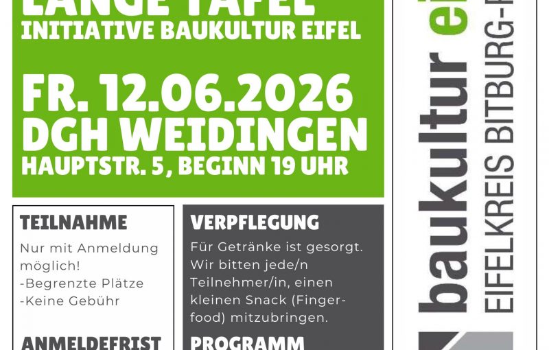 Bei der Initiative handelt es sich um eine Informations- und Bewusstseins-Kampagne zum Thema „Bauqualität – Baukultur – neues Bauen im Eifelkreis“. Der Eifelkreis Bitburg-Prüm und die Architektenkammer Rheinland-Pfalz haben 2011 gemeinsam die Initiative „Baukultur Eifel“ gestartet, um die reiche Bautradition der Eifel zu erhalten und qualitätsvoll für die Zukunft zu entwickeln.