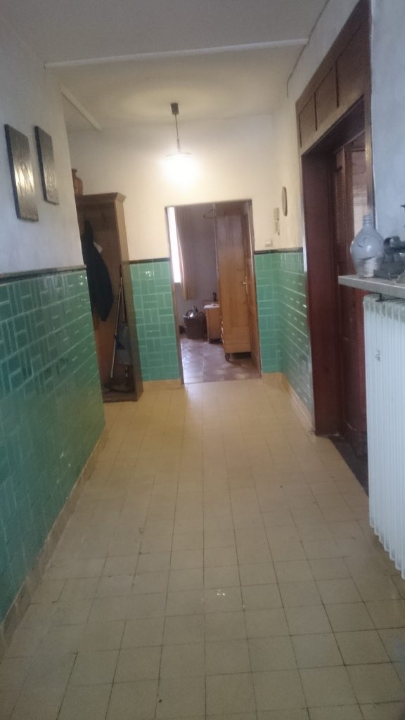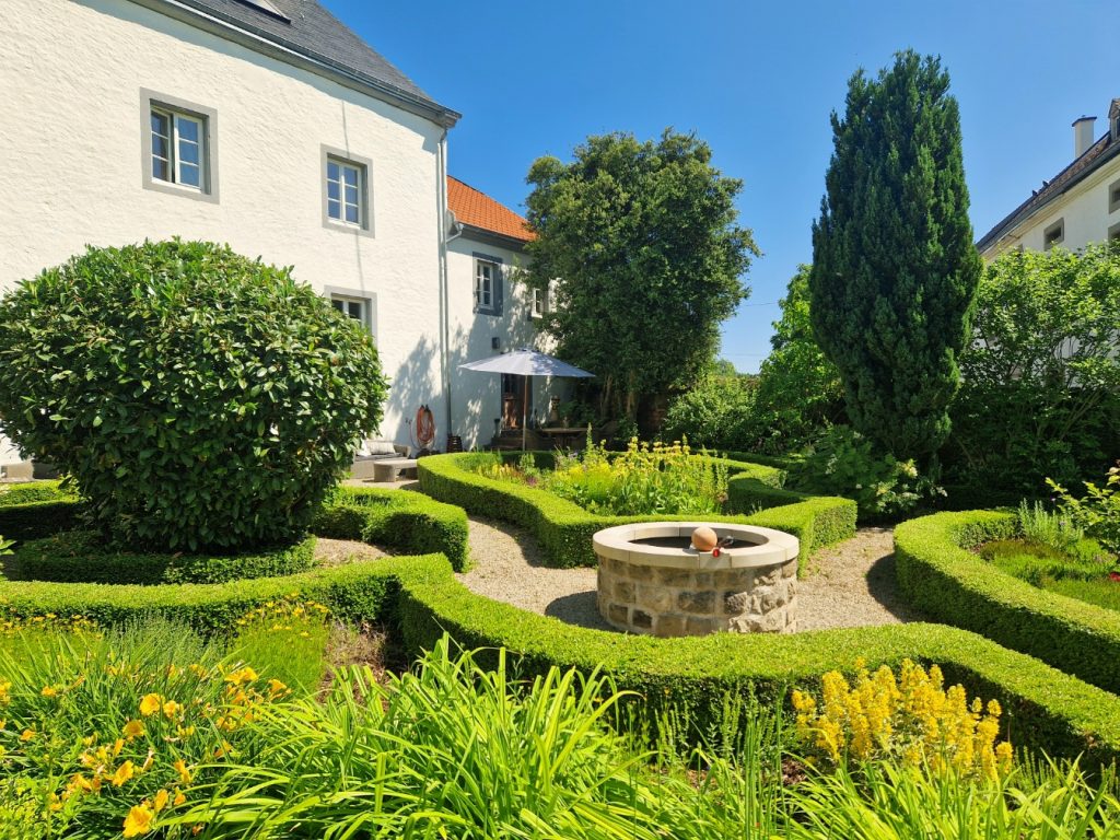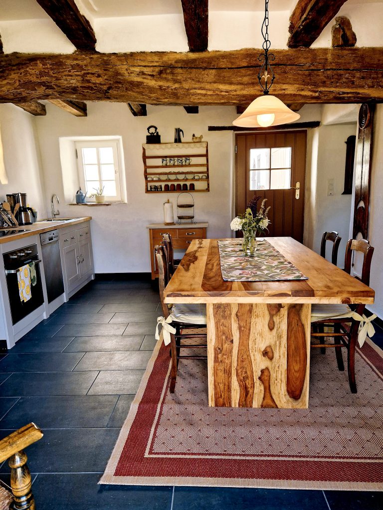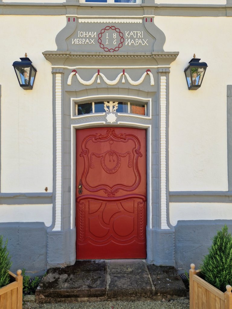 Bei der Sanierung wurde Wert auf stimmige Materialien und Oberflächen gelegt. Nutzflächen wurden mit roten Sandsteinplatten ausgelegt, Wohnräume mit Eichenholz-Böden. Die Wandoberflächen erhielten einen farblich abgestimmten Anstrich aus Mineralfarbe. Die Türgewände, der Ofenstein und die hölzernen Ausbauteile wurden passend farblich abgesetzt. Außen präsentiert sich das Wohnhaus mit neuen, zweiflügeligen Holzsprossenfenstern und dem bauzeitlichen Farbkonzept. Die Dacheindeckung aus Naturschiefer unterstreicht die Bedeutung des Wohnhauses zusätzlich.
