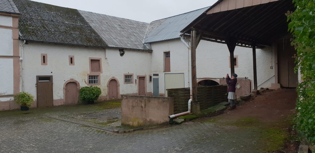 Weil der Innenhof zukünftig nicht mehr der Landwirtschaft dienen muss, konnte die befestigte Fläche auf das Notwendige verkleinert werden. Zuerst wurde der Hof vom jüngeren Beton und Teer befreit. Anschließend wurden zwei großzügige Grünflächen angelegt, in welchen jeweils ein Hofbaum gepflanzt wurde. Der entstandene Weg zwischen den Grünflächen führt mittig auf die Haustüre des Wohnhauses zu. Zuletzt wurde die nutzbare Fläche des Innenhofs mit einer wasserdurchlässigen Mineralkörnung versehen. Durch Zugabe eines Bindemittels, ist diese Mineralkörnung eben und befestigt.