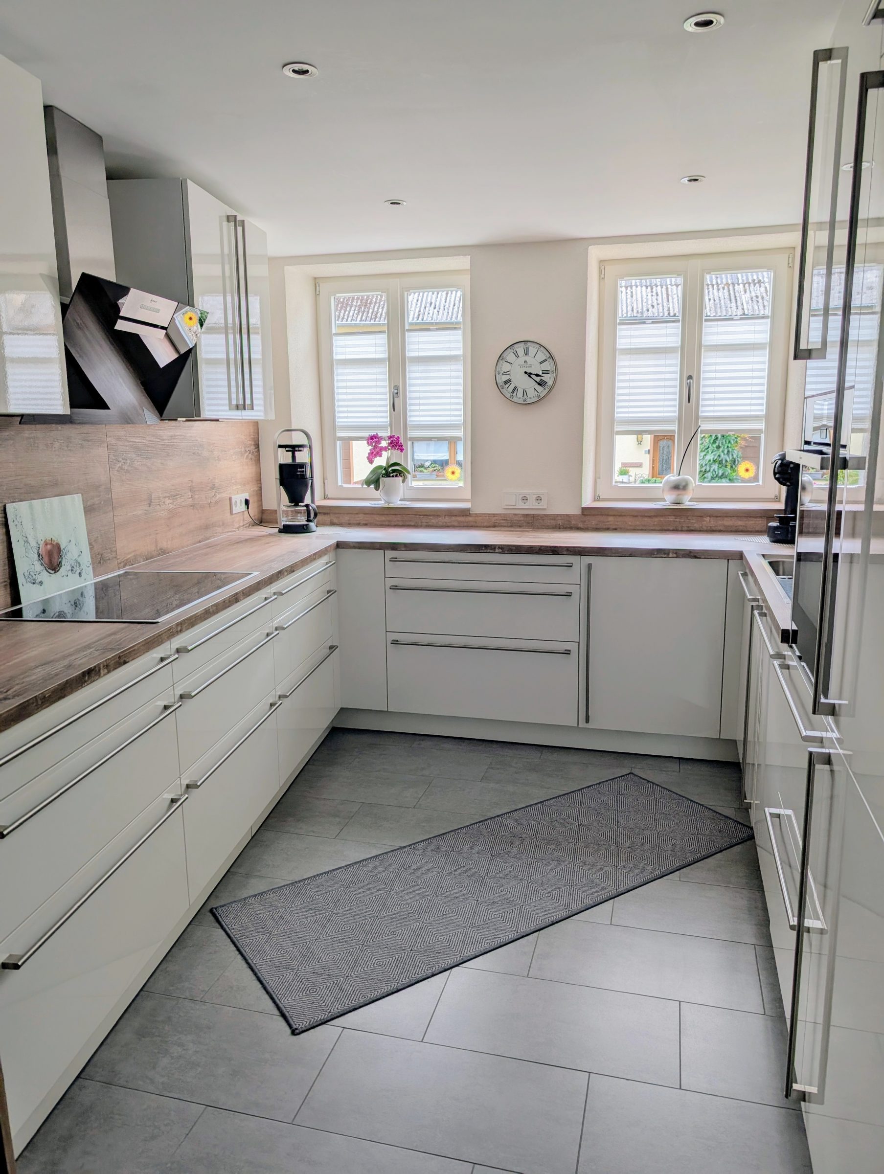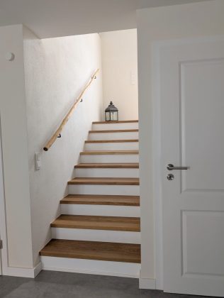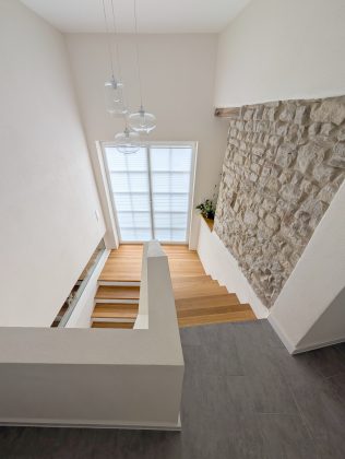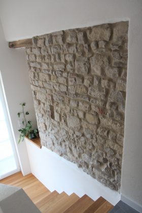 Aus ehemaligem Stall, Scheune und Werkstatt entstanden Technik-, Garagen- und neue Wohnflächen mit hellen und gut gestalteten Räumen. Das Wohngebäude wurde im Grundriss überarbeitet und an zeitgemäße Wohnbedürfnisse angepasst. Dabei wurden vorhandene historische Baumaterialien wie Bruchsteinwände und Holzstürze freigelegt und in das Gestaltungskonzept als Akzente eingesetzt.