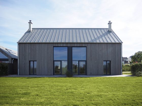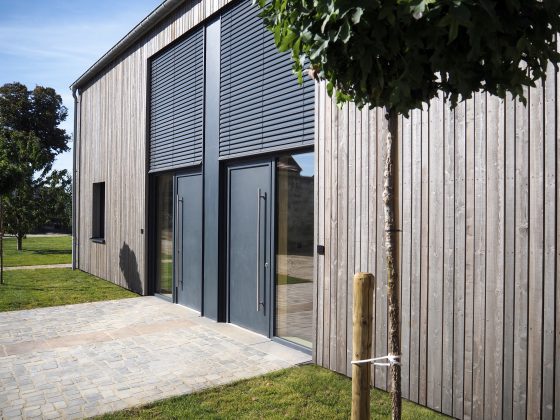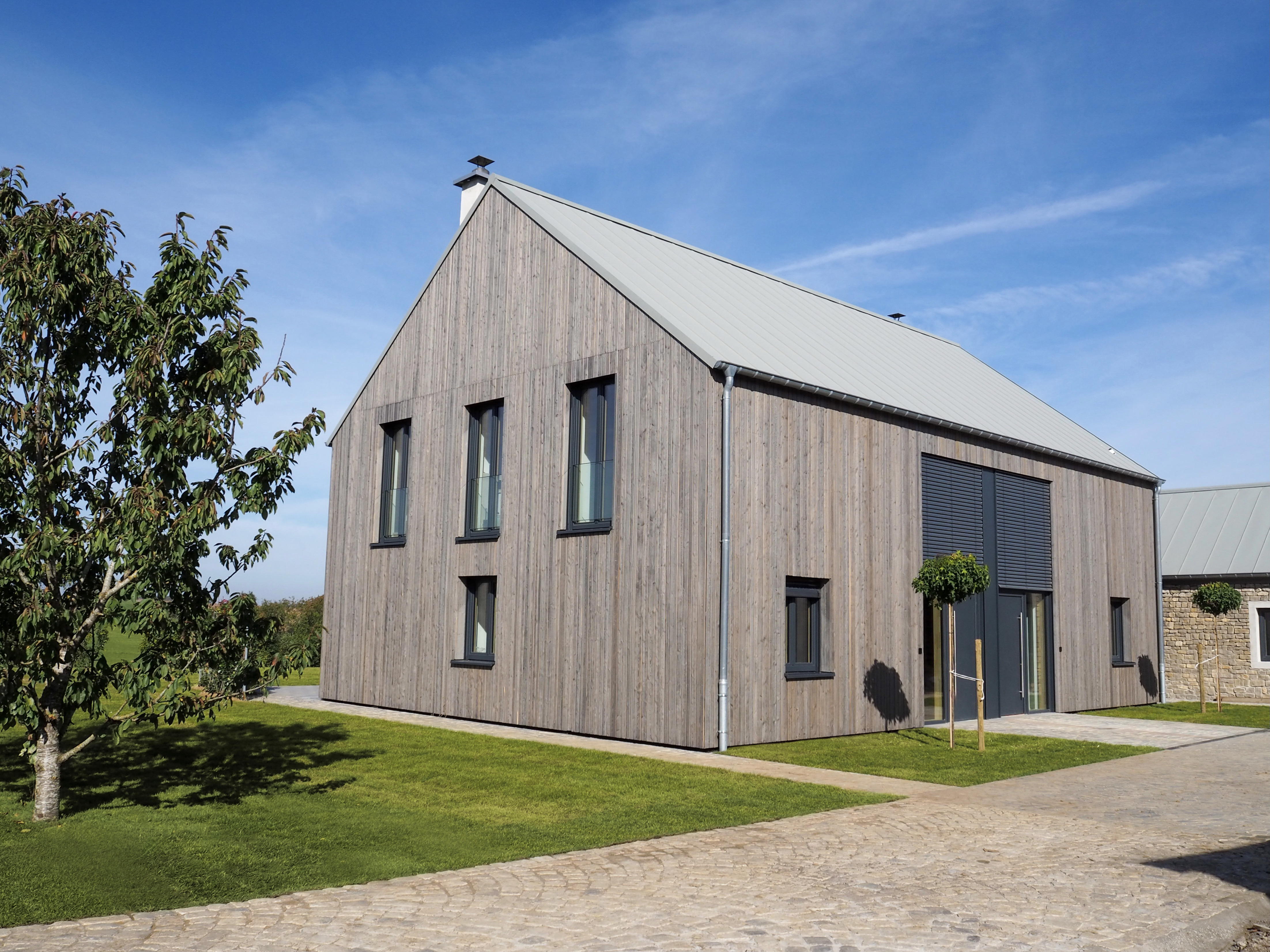 An das Haupthaus schließt sich ein kleineres Gebäude mit Natursteinfassade an. Dort befinden sich Wellnessbereich mit Sauna und Whirlpool, Technikräume und zwei Garagen. Die Natursteinfassade bildet einen reizvollen Kontrast zur Holzverkleidung des Hauptgebäudes und erinnert an ein Stallgebäude – erneut der Scheunencharakter. Im Innenraum kommt eine sichtbare Dach- und Deckenkonstruktion aus altem Eichenholz zum Einsatz. Dazu passen Natursteinfassaden im Treppenhaus sowie Stein- und Holzböden.