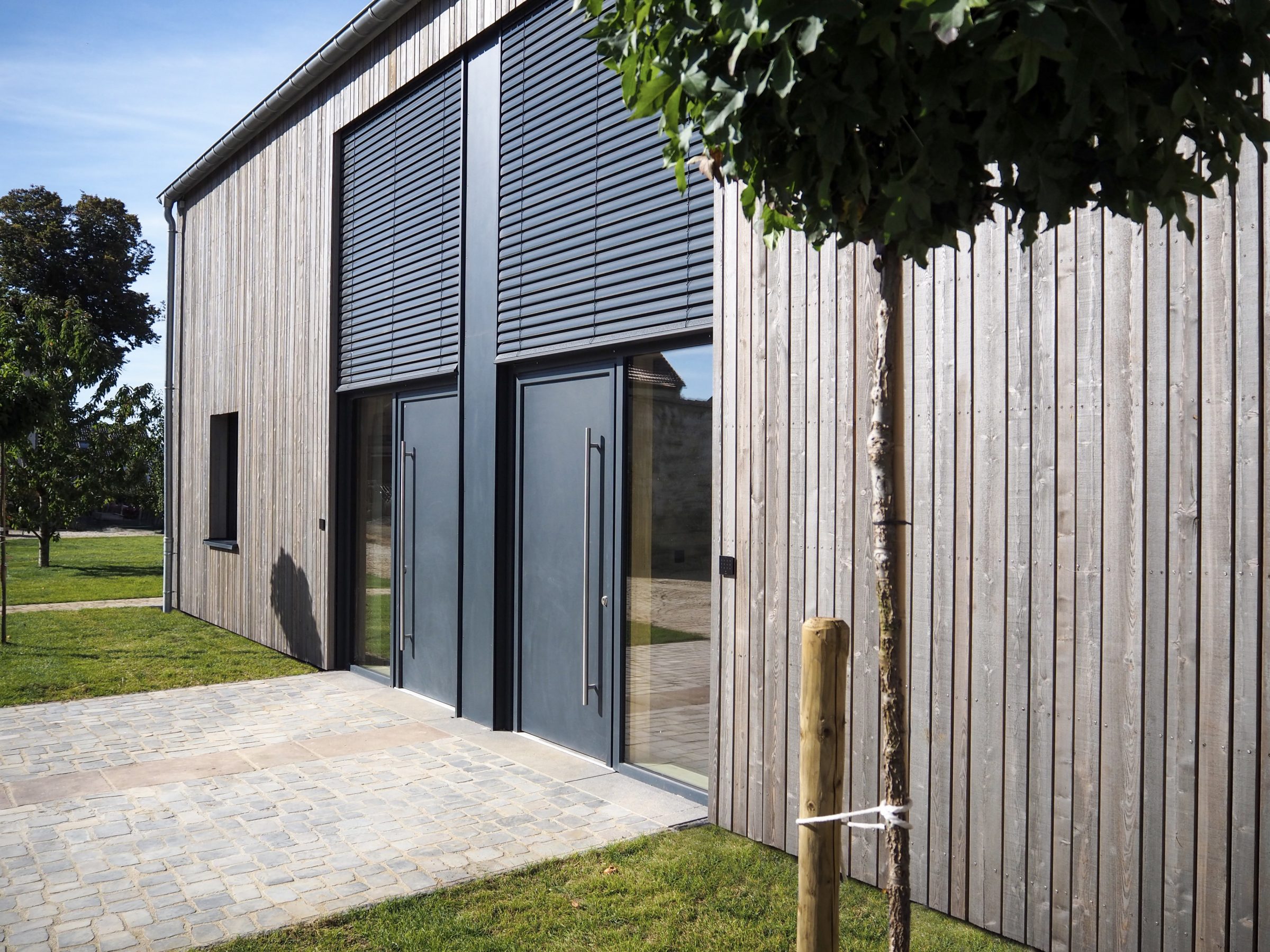 Der Neubau wurde im Charakter einer Scheune konzipiert und greift die regionaltypische Bauweise auf. Ein klarer, einfacher Baukörper mit gegliederter Fassade und Satteldach ohne Überstand. Das zweigeschossige Doppelhaus, ist mir Lärchenholz verkleidet. Dazu trägt auch die Gestaltung des Eingangsbereichs bei, der in seiner Größe an ein Scheunentor erinnert.