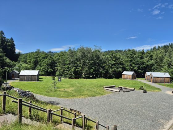 Gesamtanlage mit Schlafhütten, Haupthaus und Aufenthalsfläche im Freien.