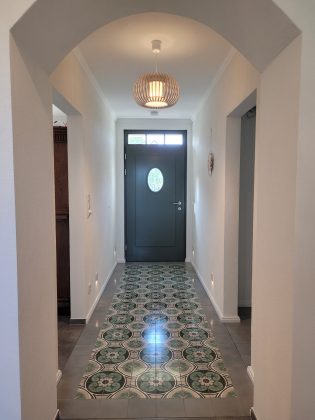 Ein neuer Dachstuhl, neue Deckenbalken und Wände wurden eingebaut. Im Eingangsbereich wurden traditionelle Zementfliesen und die originale Haustür wiederhergestellt. Die Raumaufteilung im Erdgeschoss wurde großzügiger gestaltet: Küche und Esszimmer wurden verbunden und vom Wohnzimmer aus gelangt man in die ehemalige Scheune, die heute das Herzstück des Hauses ist. Das Dach wurde angepasst, um eine gemütliche Atmosphäre zu schaffen, mit alten Eichenbalken als Erinnerung an die ursprüngliche Konstruktion.